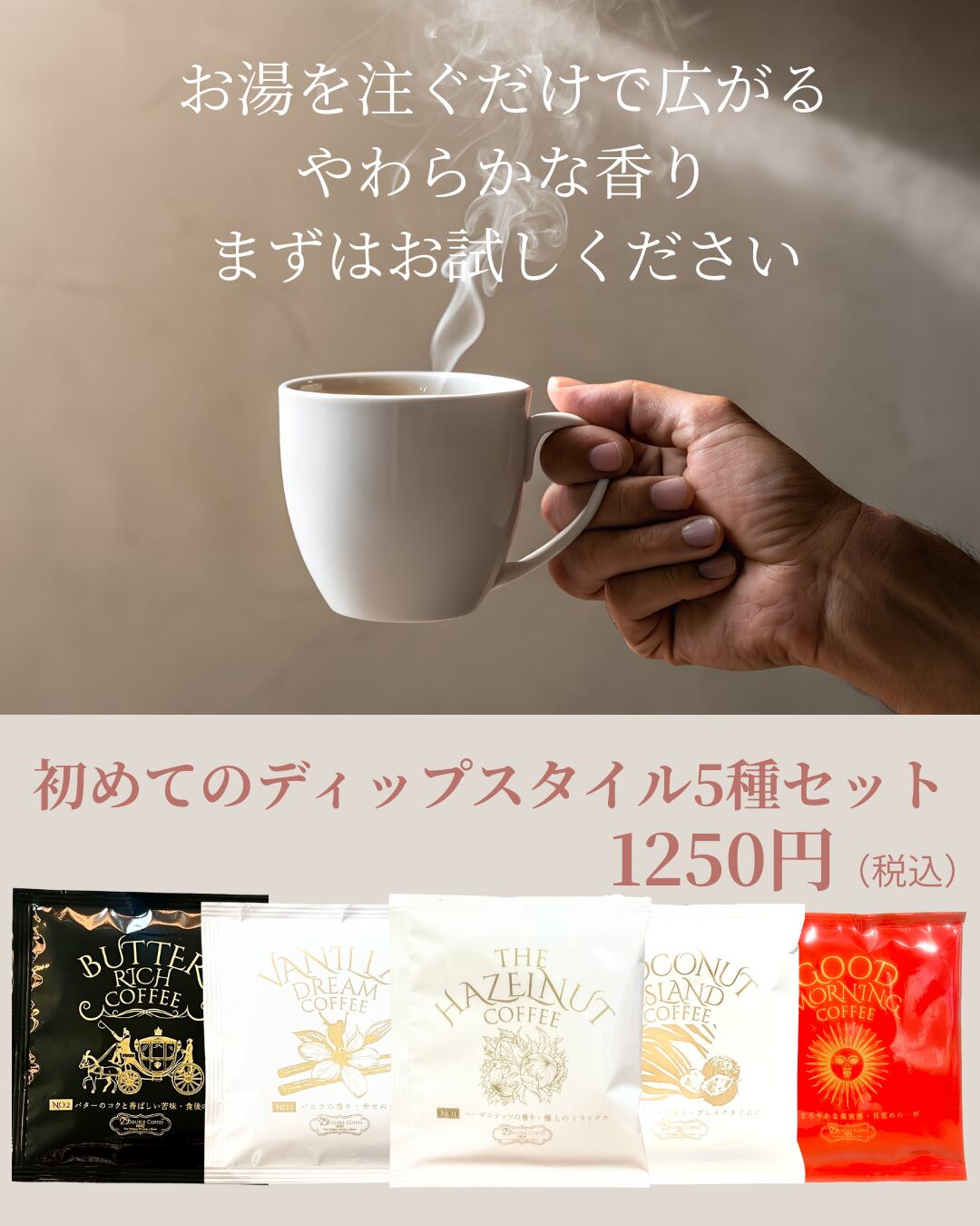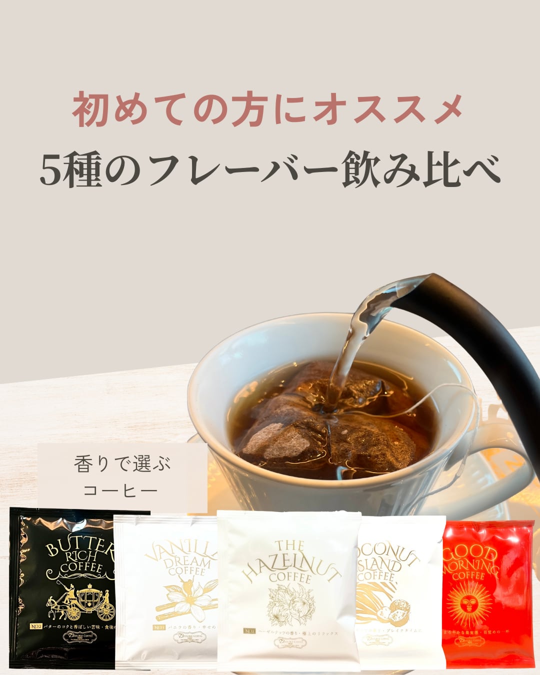 5つの香りを少しずつ楽しめる、ディップスタイルのフレーバーコーヒーセットです。